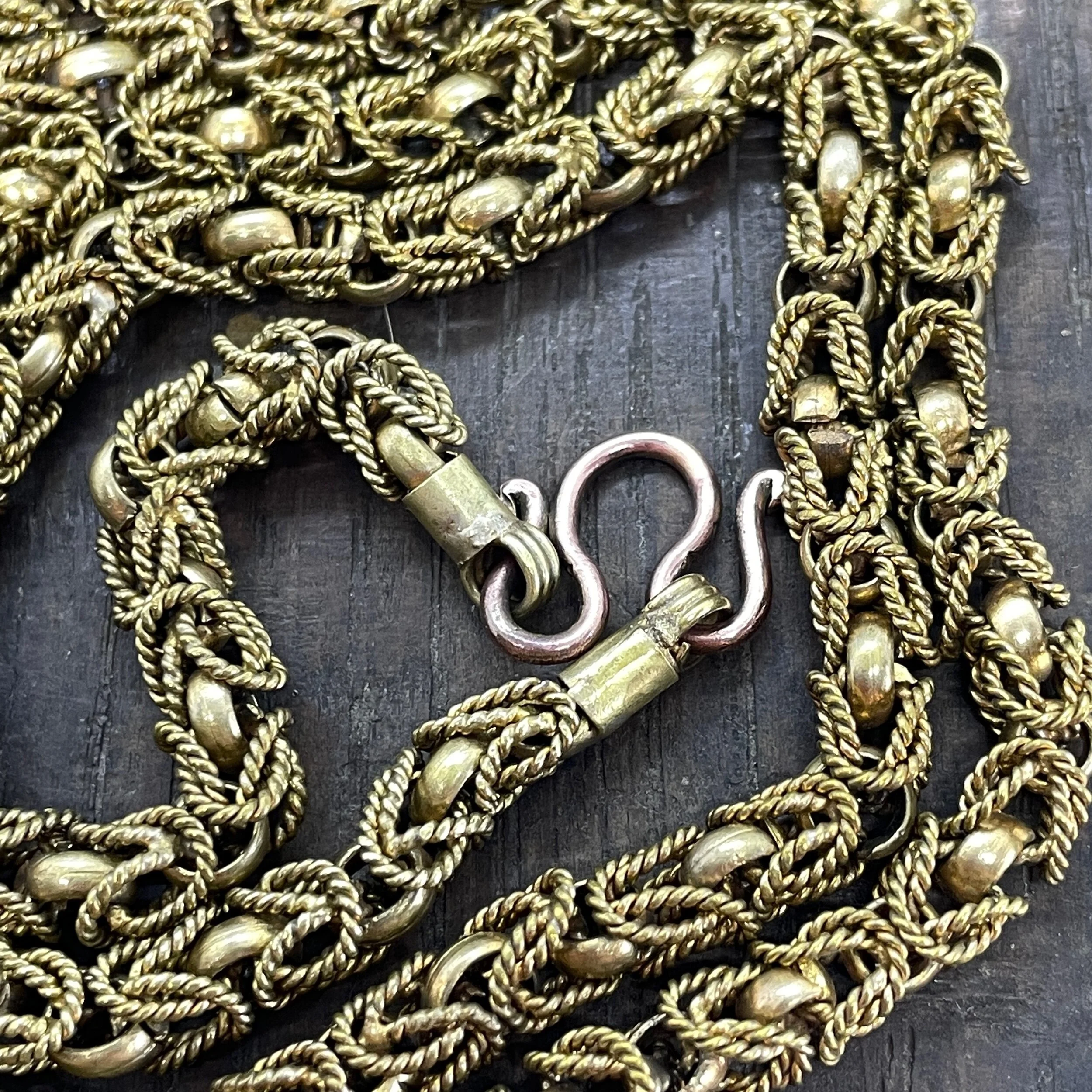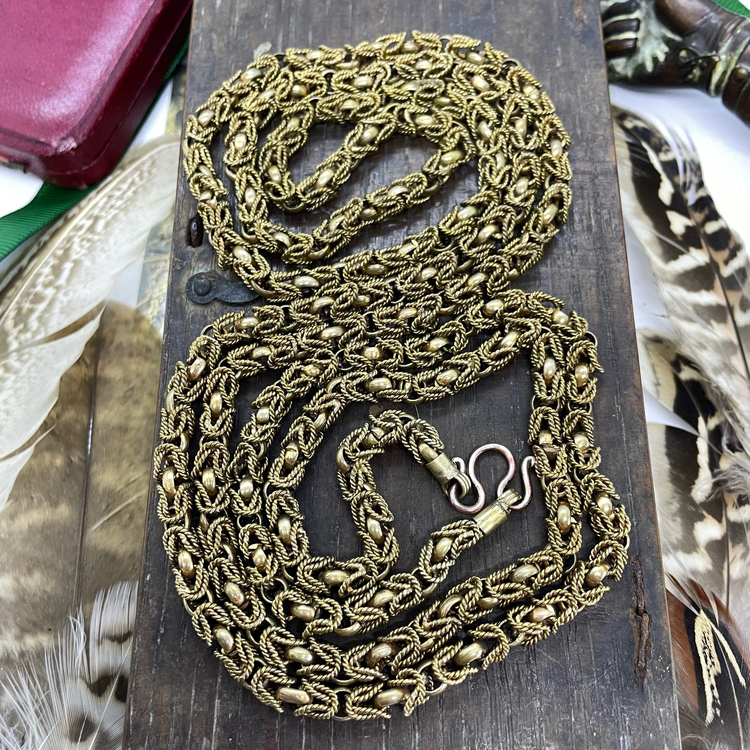 This amazing Victorian guard chain is made from gilt metal (pinchbeck or similar). It has a fancy link, comprising of double rope-twist infinity links connected to round rolo links, to form this wonderful thick chain with capped ends that join together via a copper hook clasp. At 47.5” or 121cm there are multiple ways to wear it - as a necklace, wrapped once twice or even three times (I’m 5’10” and fairly stocky but managed a triple wrap without feeling strangled!), or as a bracelet.