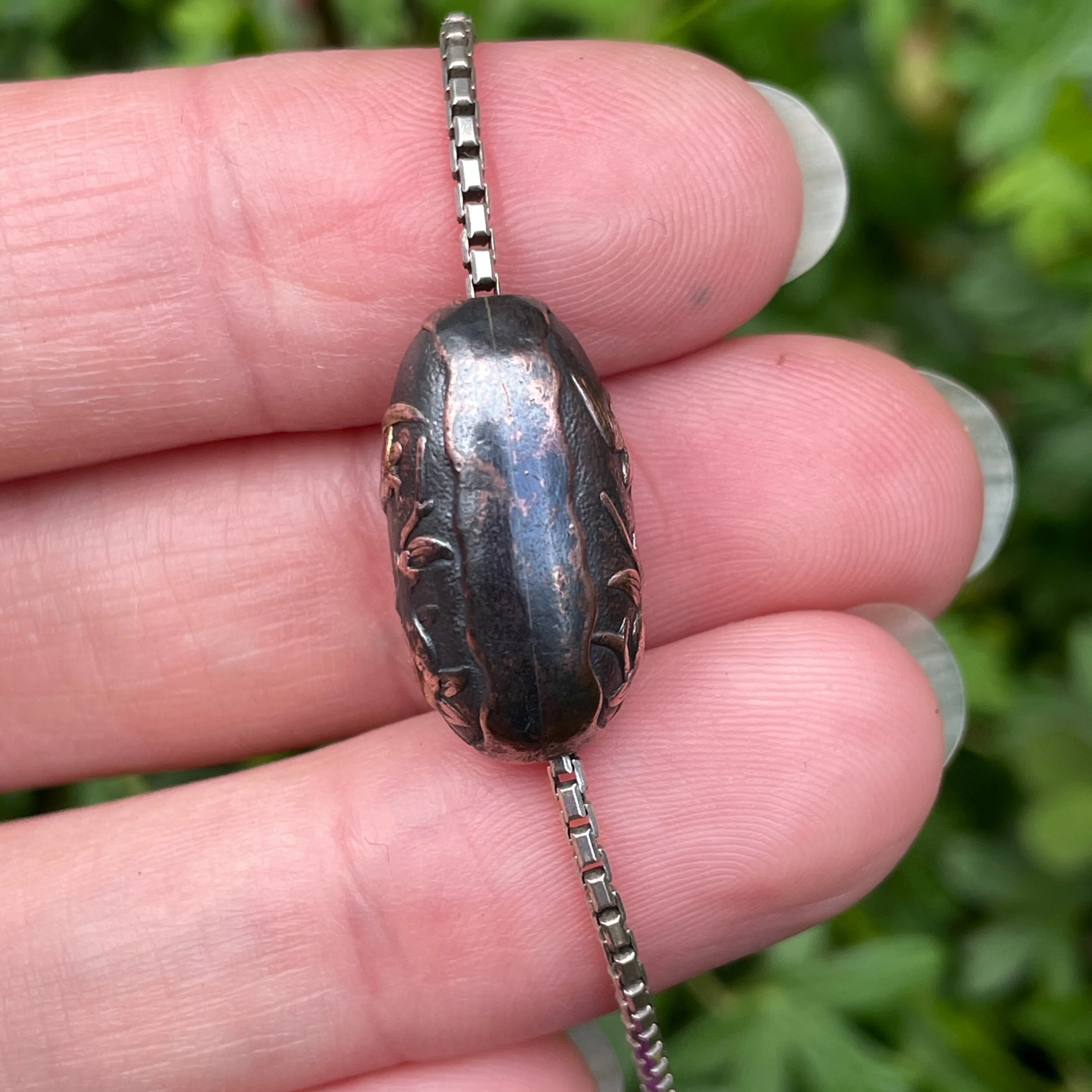 This necklace features a 19th Century Japanese ojime (toggle) bead. It’s mixed metal (shakudo) and appears to be an allow of copper and gold. It is decorated on both the front and back with a bird and pomegranate. The bird’s wings and the fruit’s seeds are gold, the rest is copper. It’s hung on a modern sterling silver chain.