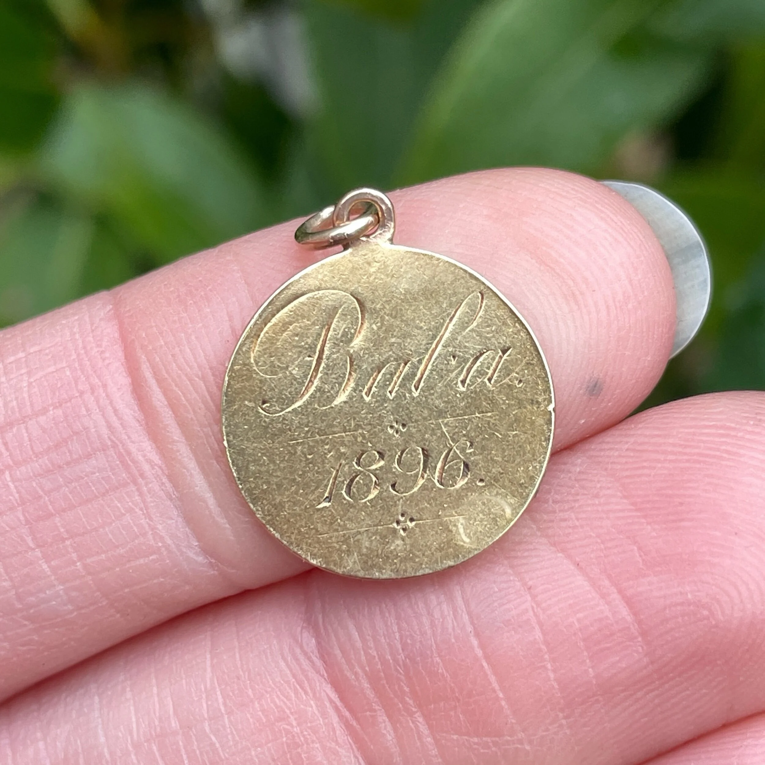This antique pendant is made from unmarked yellow gold. It’s enamelled on one side with a white bird on a pond, with reeds and a bullrush to the edge. On the reverse the name Baba is engraved, with the date 1896. It’s unmarked but acid tests as at least 9ct gold and there’s a split ring at the top for hanging.