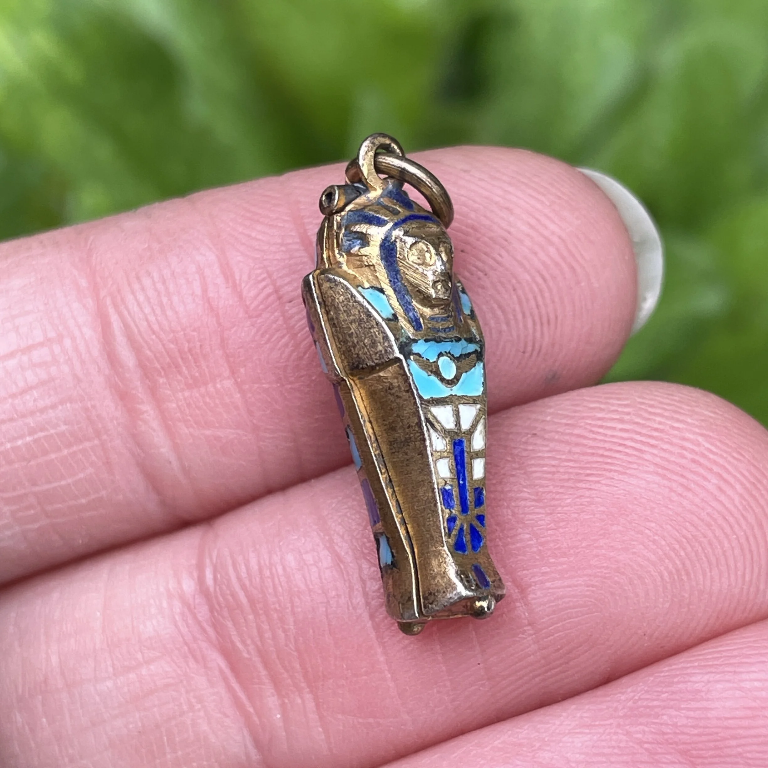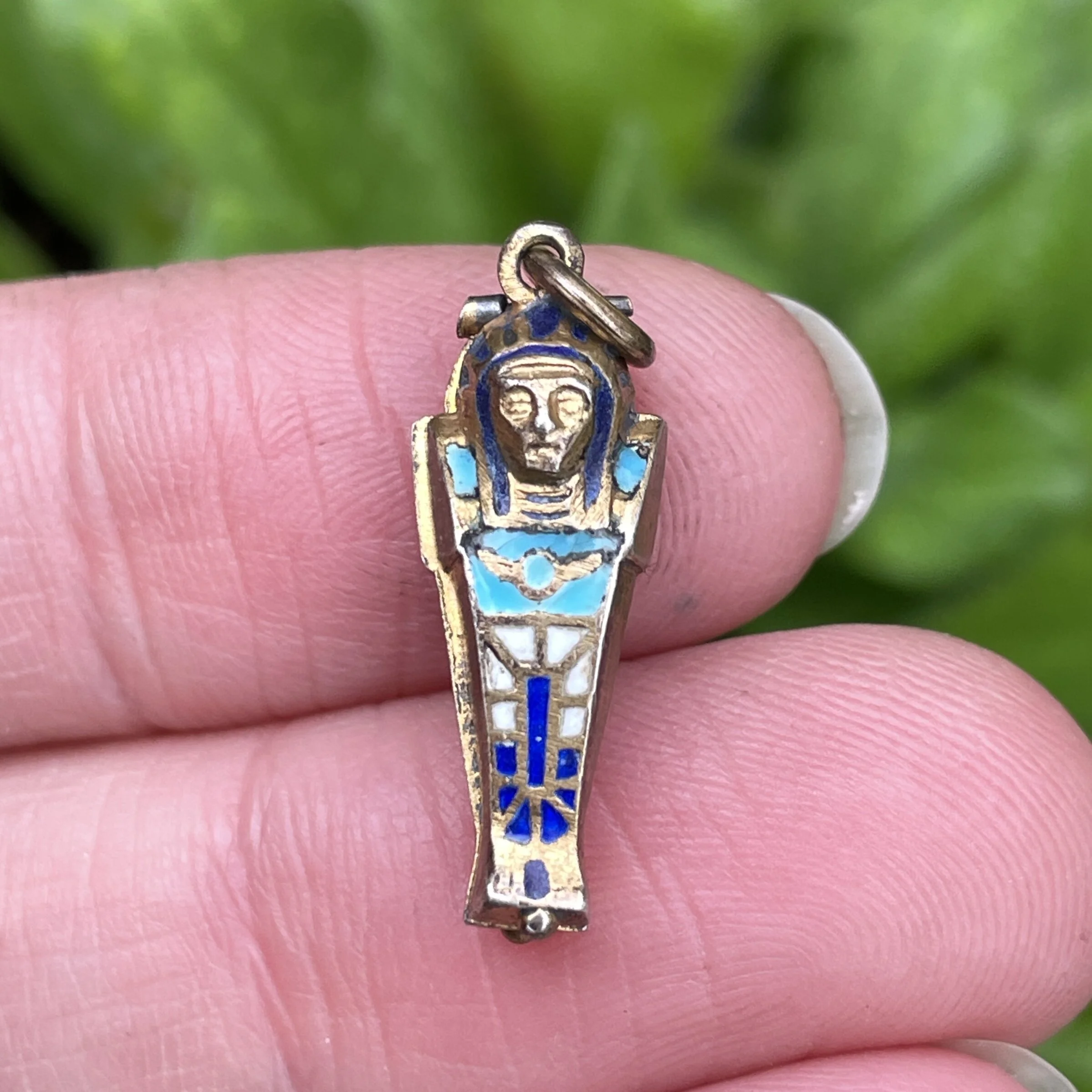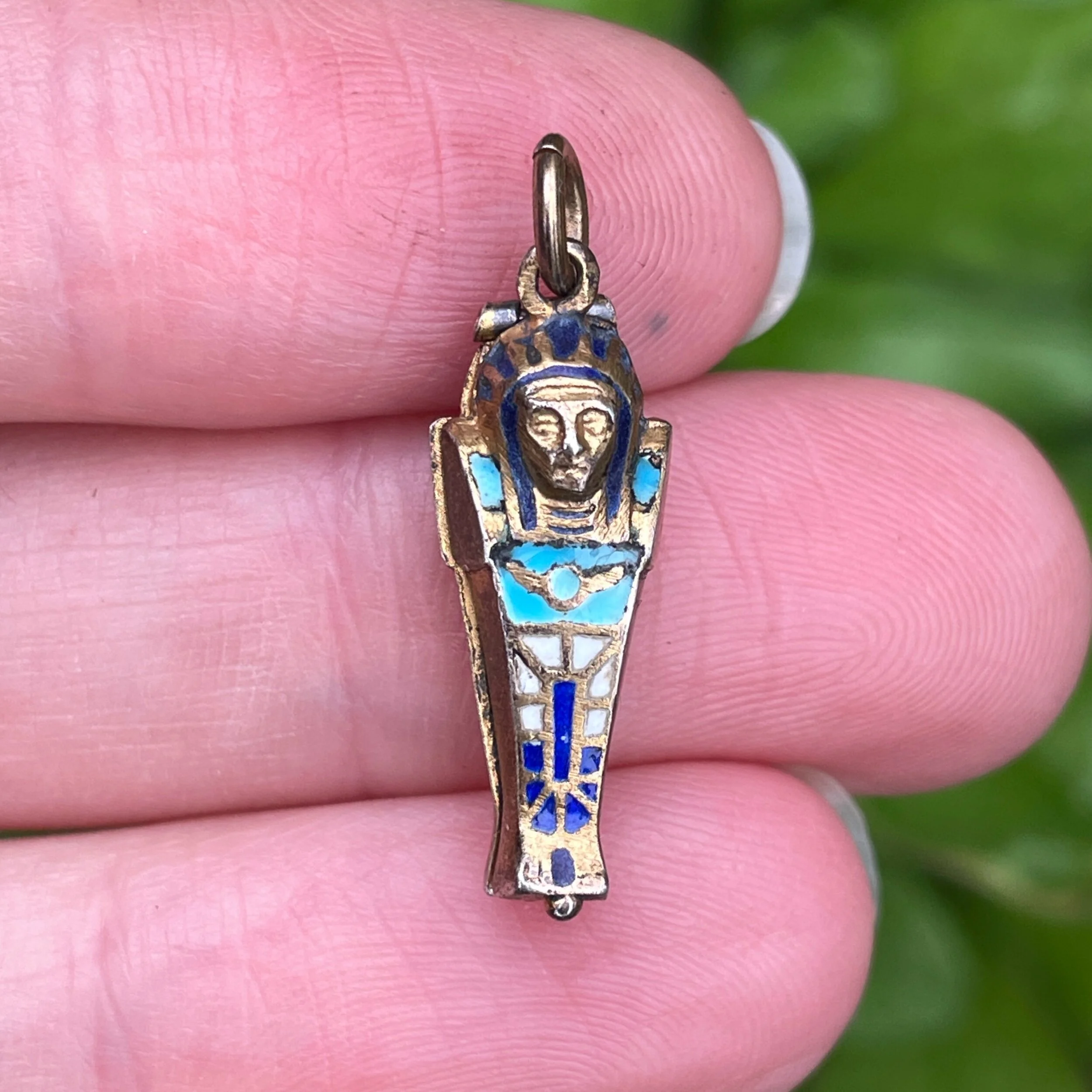 This antique pendant is made from 800 silver and it dates from around 1920. It’s shaped like an Egyptian sarcophagus, with blue and white enamelled detailing front and back, and the silver has been gilded to give it a golden finish. When you open it up, there’s a tiny mummy inside, which also has blue enamel on the front. It’s stamped as 800 grade silver within the sarcophagus.