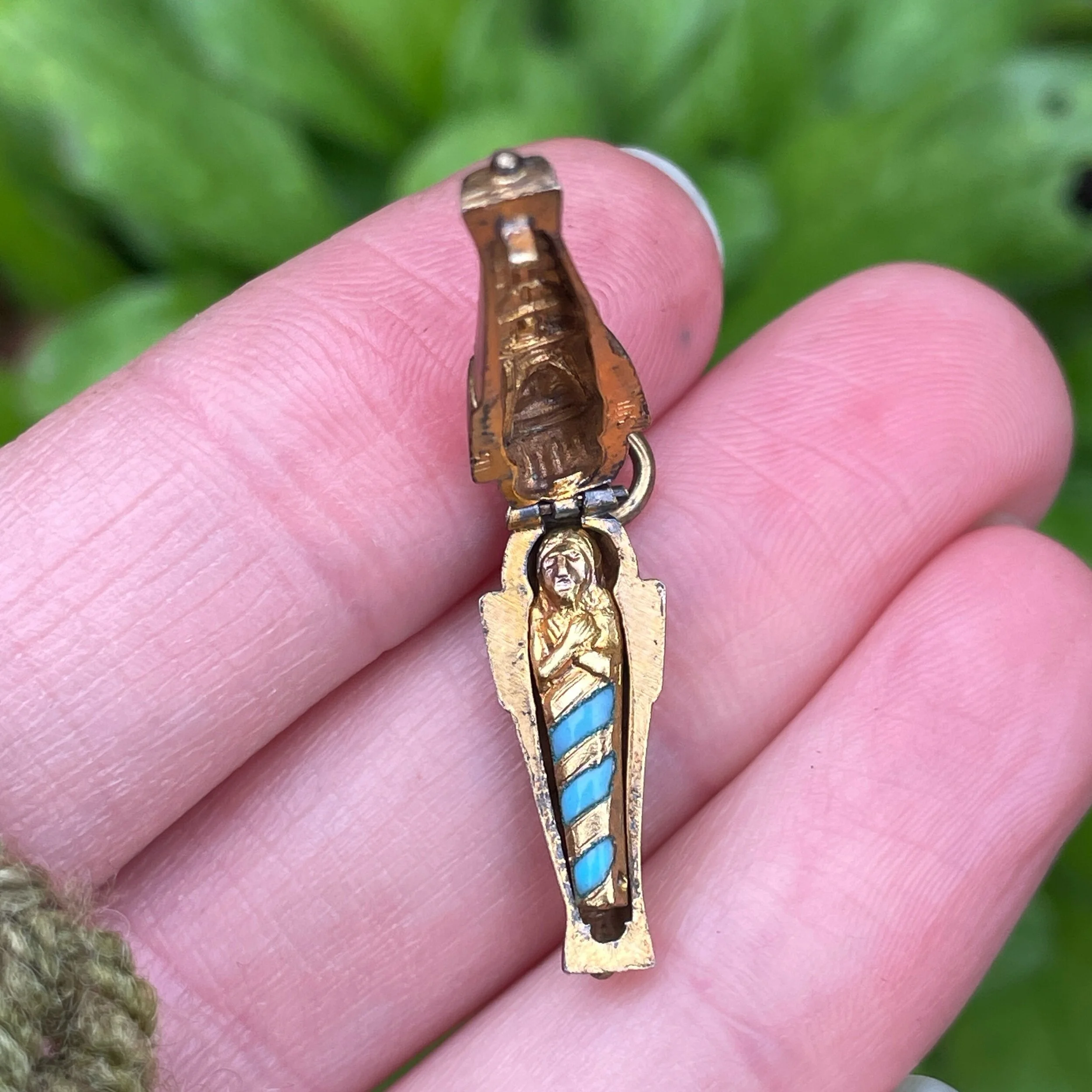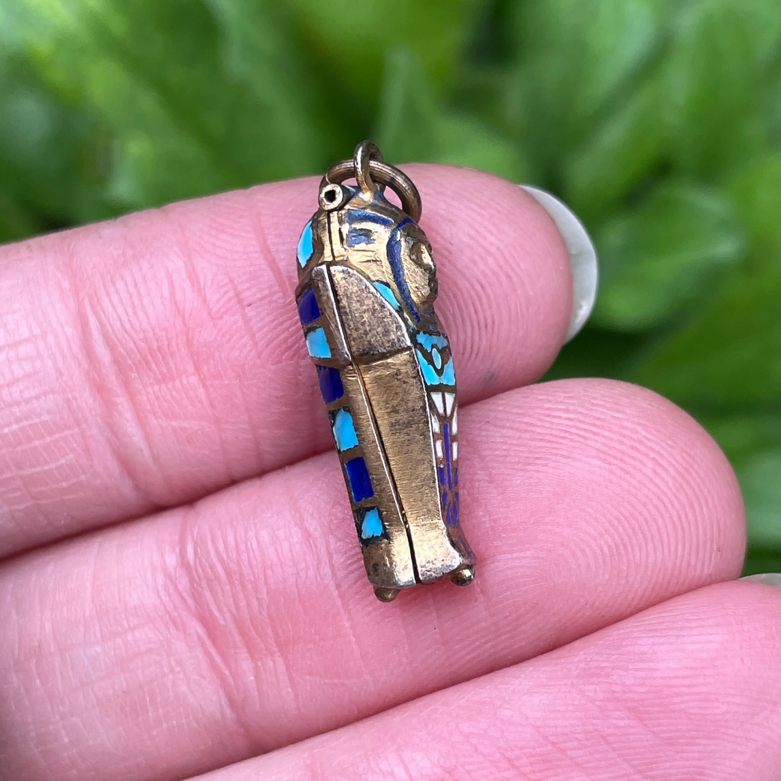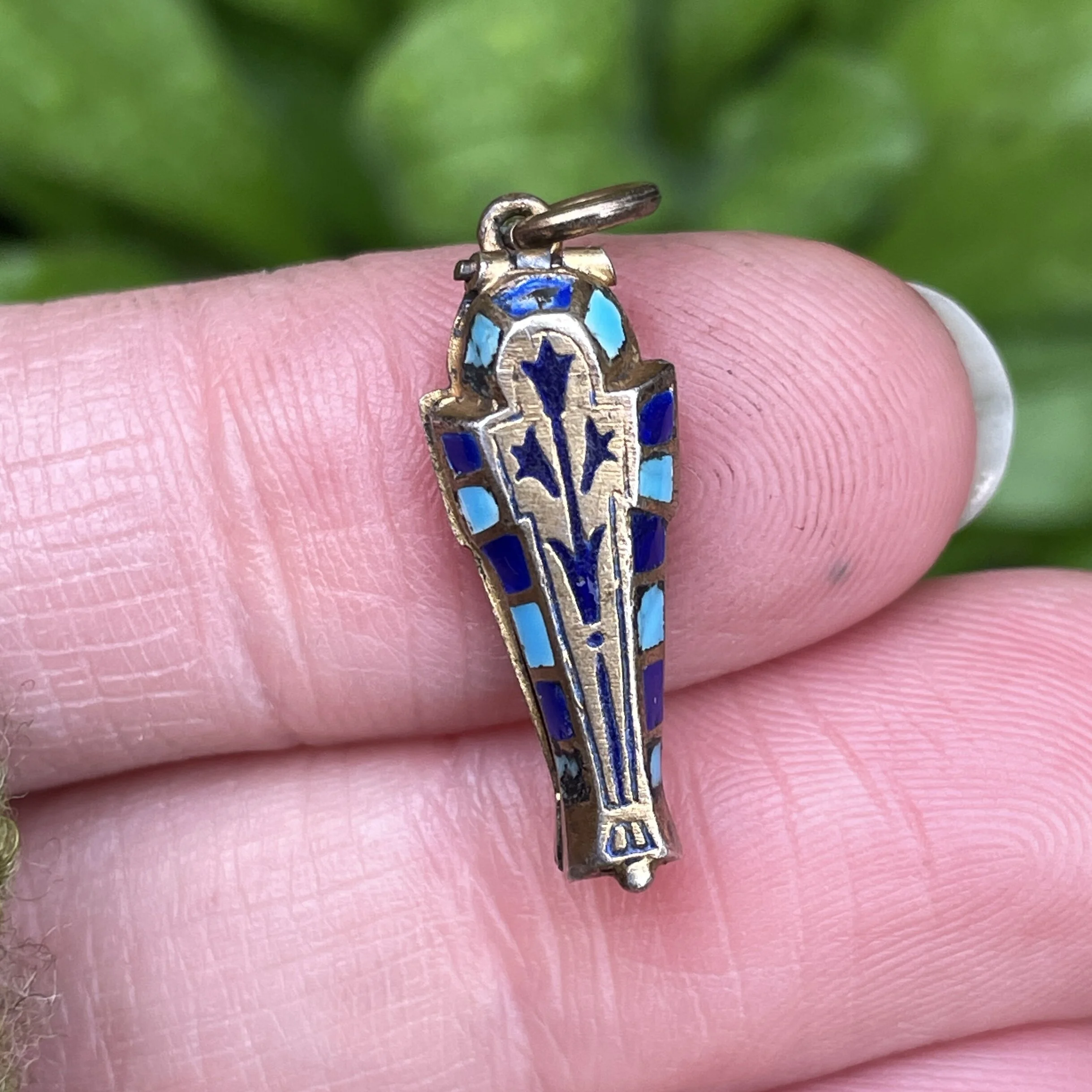 This antique pendant is made from 800 silver and it dates from around 1920. It’s shaped like an Egyptian sarcophagus, with blue and white enamelled detailing front and back, and the silver has been gilded to give it a golden finish. When you open it up, there’s a tiny mummy inside, which also has blue enamel on the front. It’s stamped as 800 grade silver within the sarcophagus.