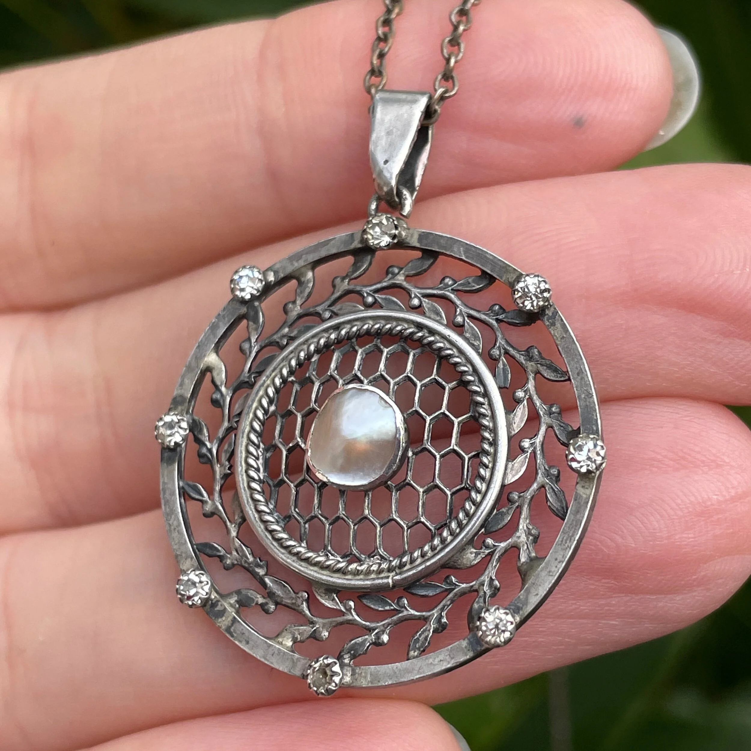 This antique pendant and chain are made from silver, set with a mabé pearl in the centre, with little claw-set white pastes around the edge. The pearl is set within a honeycomb design panel, and if you look carefully this is surrounded by little mistletoe leaves. It’s hung on an 18” chain with barrel clasp. Both pendant and chain are unmarked but test as silver and I am 100% confident that this design can be attributed to Charles Horner, c.1900.