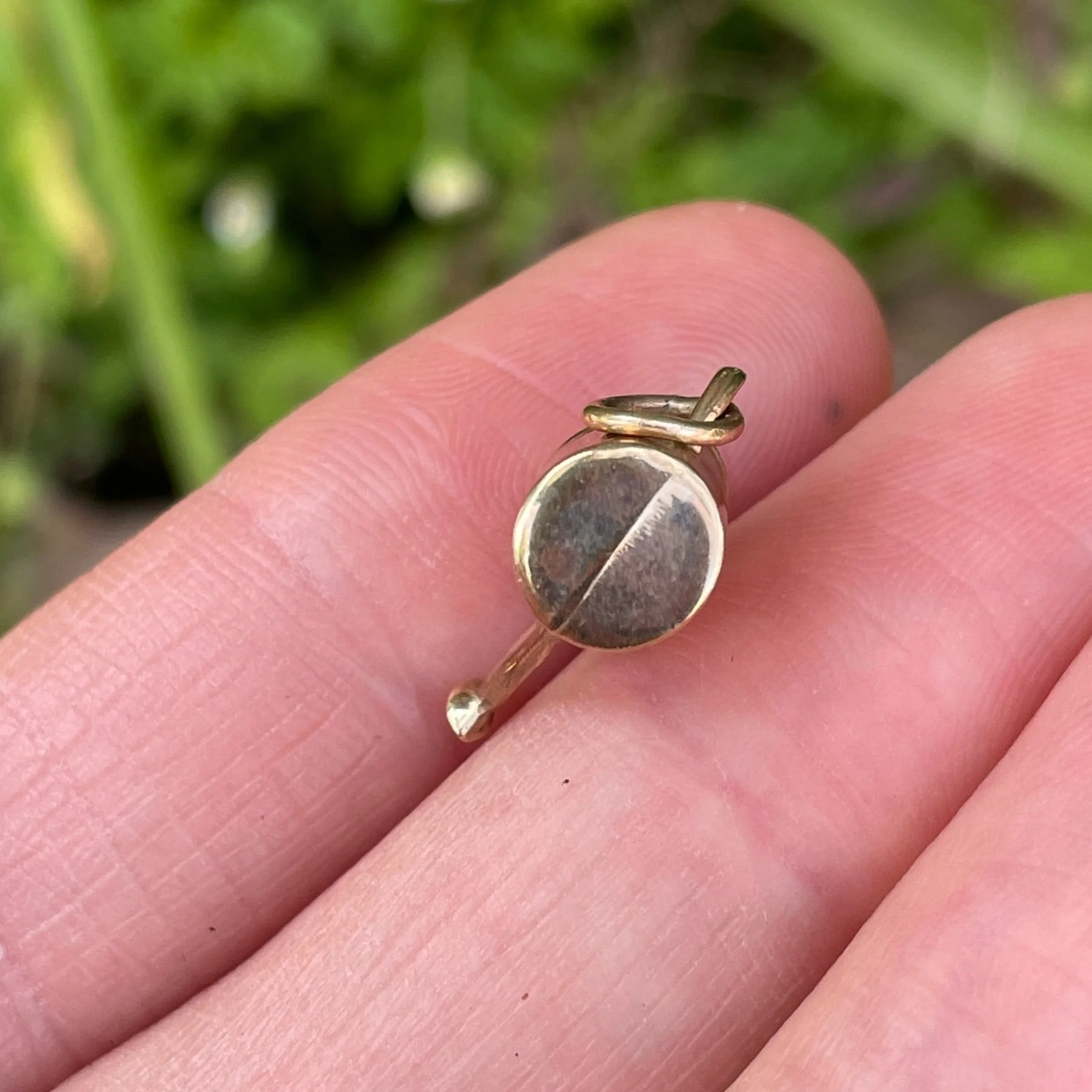 Here I have a vintage 9ct yellow gold charm or pendant in the form of a watering can. It’s fully hallmarked on the side with the date letter for 1979. There’s a soldered-shut ring on the handle for hanging on a chain.