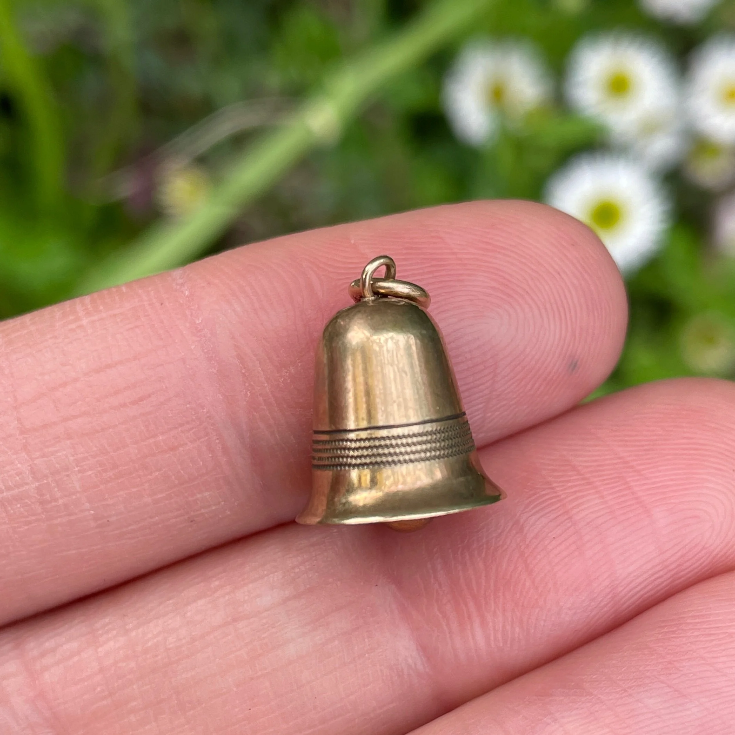 Here I have a vintage 9ct yellow gold charm or pendant in the form of a bell which rings gently when you wiggle it! It’s fully hallmarked on the top, the date letter for 1979. There’s a soldered-shut ring on the handle for hanging on a chain.