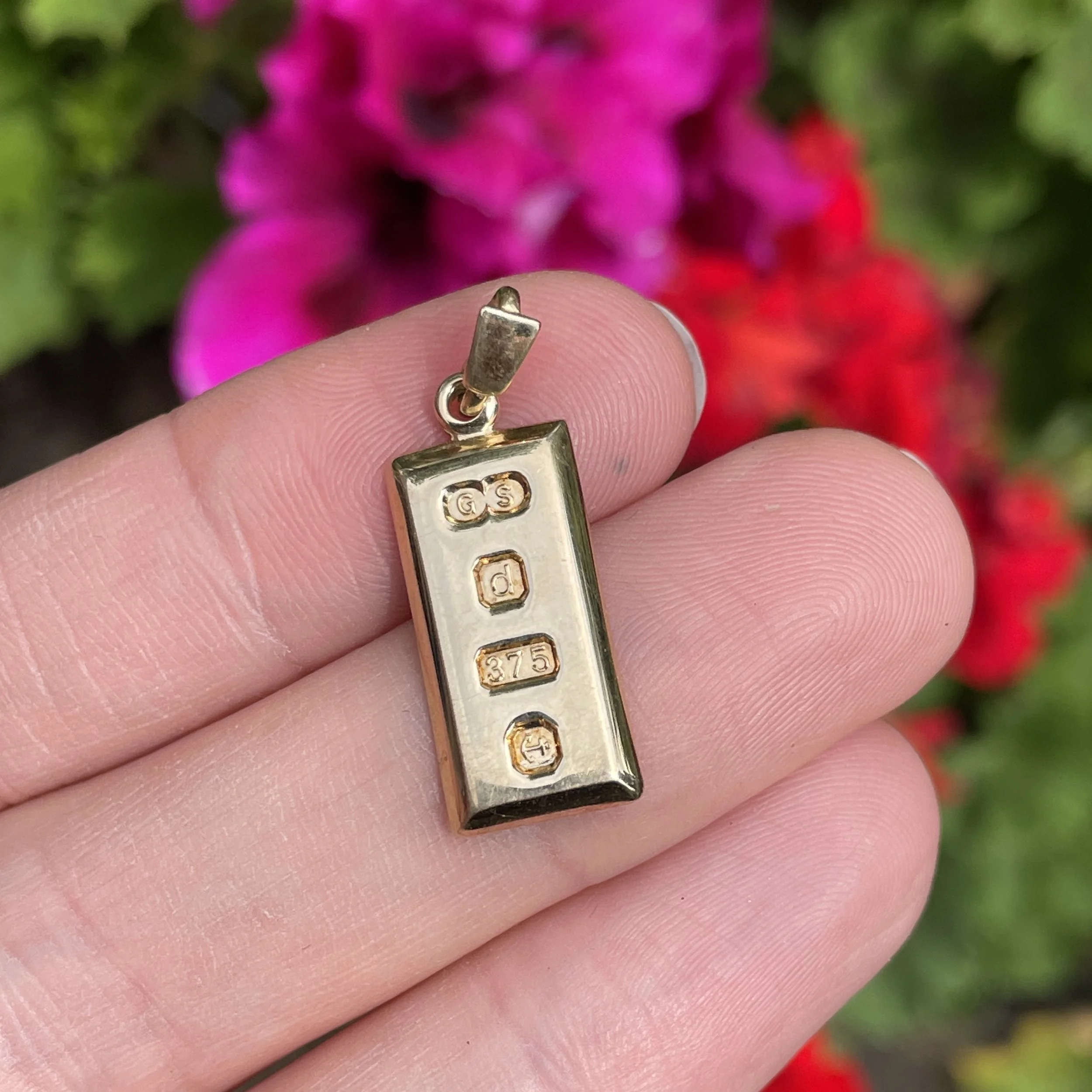 Here I have a pre-owned 9ct gold ingot pendant, produced by the Royal Mint in 2003. The front has statement hallmarks, from the Birmingham Assay Office, with the date letter for 2003 and the sponsor’s mark GS, for Gerald Sheehan, Chief Executive of the Royal Mint at the time. The back is engraved with Limited Edition, the number 0273 (out of 2000 I believe), 1/10 oz and an image of the Tower of London, where the Royal Mint was located for many years.