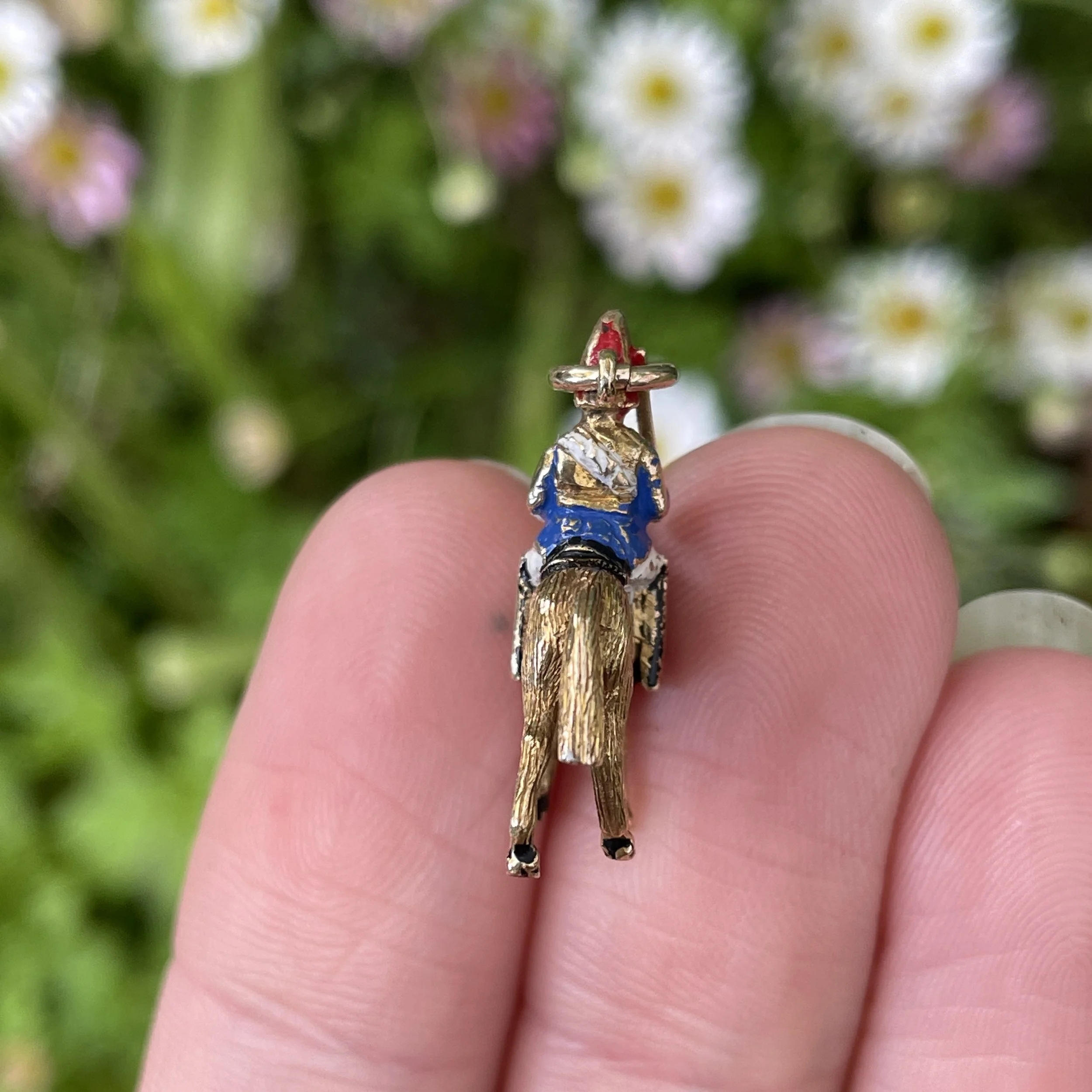 Here I have a vintage 9ct yellow gold and enamel charm or pendant in the form of a horseguard. It has lovely detailing from the soldier’s uniform and raised sword, right down to the little lines giving the impression of the horse’s coat! It’s a good solid charm and can stand freely which is always a nice touch! There’s a split ring at the top for hanging and although I cant find any hallmarks, it acid tests as 9ct gold.