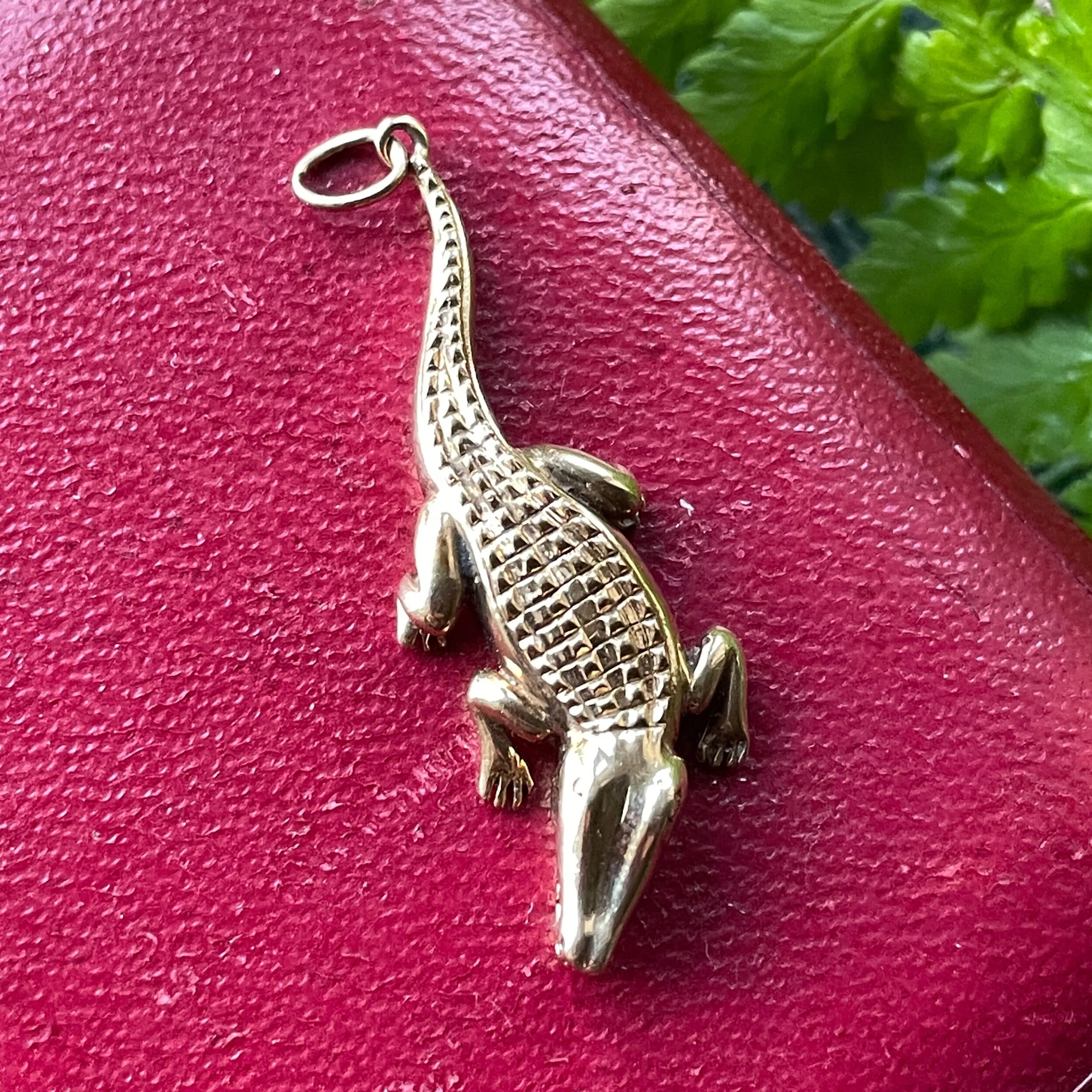 Here I have a pre-owned 9ct yellow gold pendant in the form of a crocodile. It’s a good sized piece, with great detailing - the scales on its back are fab! There’s a full UK hallmark on the bale ring at the top.