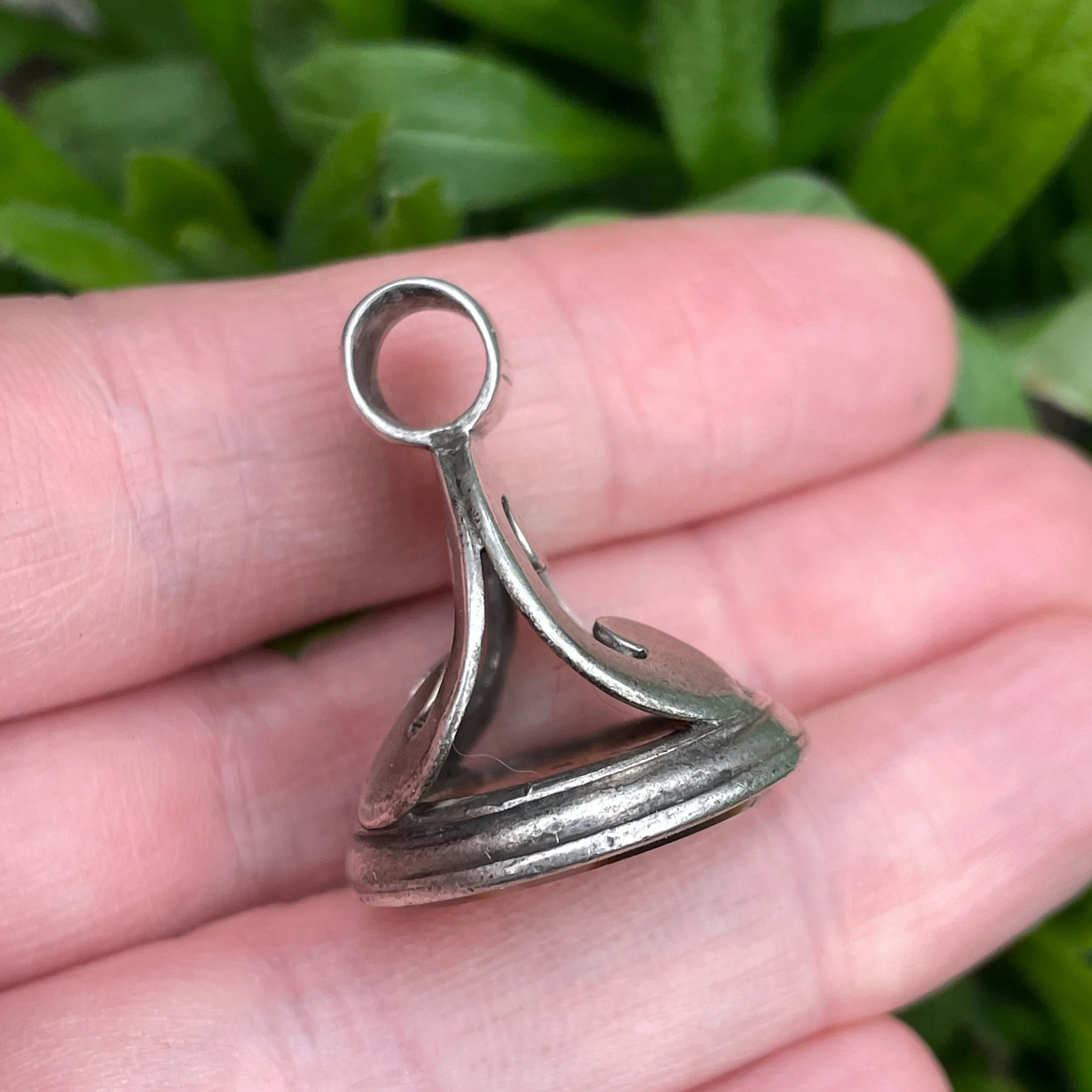 This Georgian wax seal pendant is made of silver. It’s set with aa beautiful Scottish agate gemstone and it’s never been engraved. Above the agate are pierced scrolled shoulders and there’s a large bale at the top with engraved line decoration. It’s unmarked but acid tests as silver.