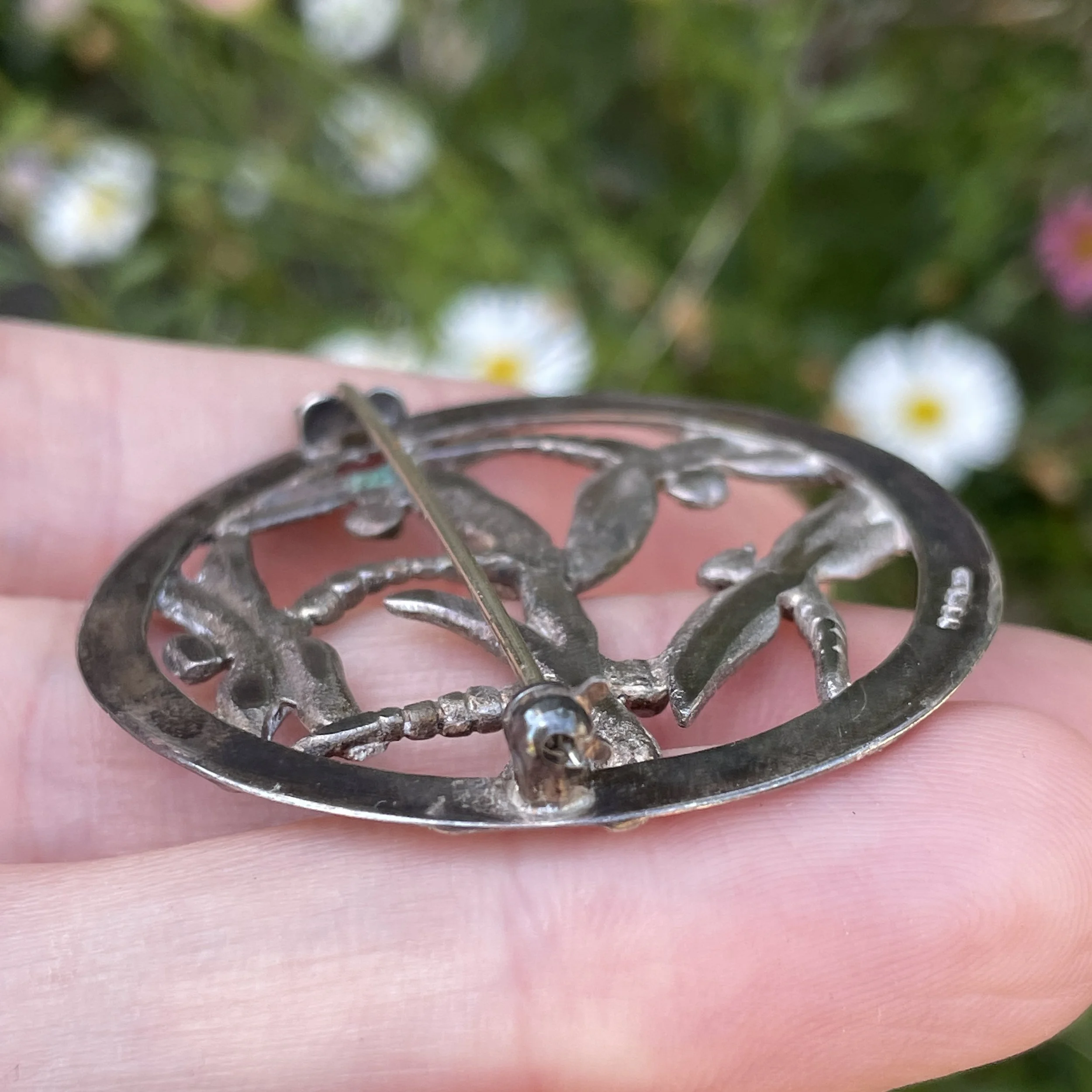 Here I have a vintage sterling silver brooch featuring 5 dragonflies within a circular frame. The back fastens with a rollover-clasp and steel pin. It’s full hallmarked for sterling silver, with the date letter for 1991 from the London Assay Office.
