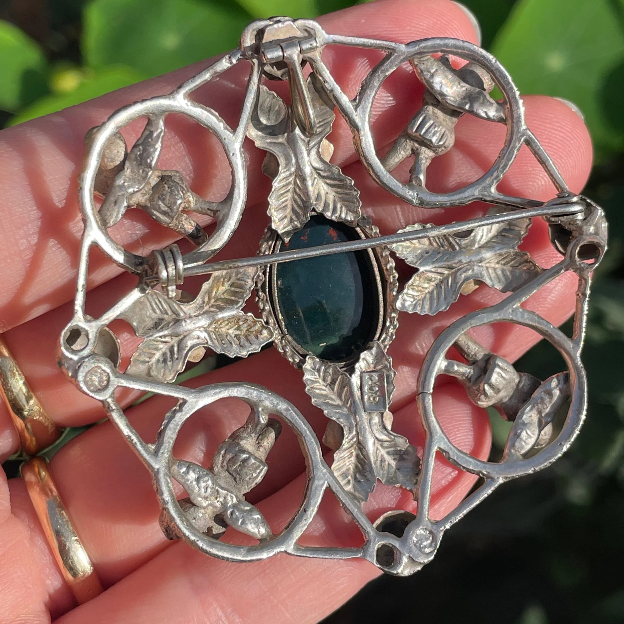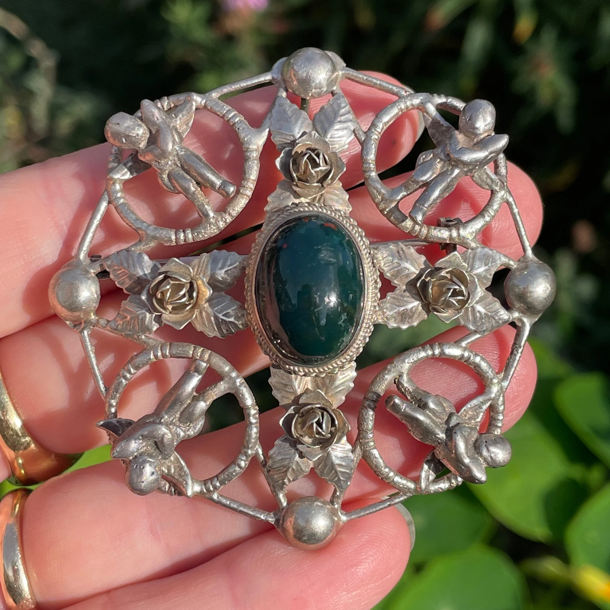 Here I have a vintage 800 silver brooch or pendant. It features a central bloodstone with sculptural silver roses and leaves and cast cherubs around the edge. It’s stamped 800 on the back and has a folding pendant bale and a rollover safety clasp.