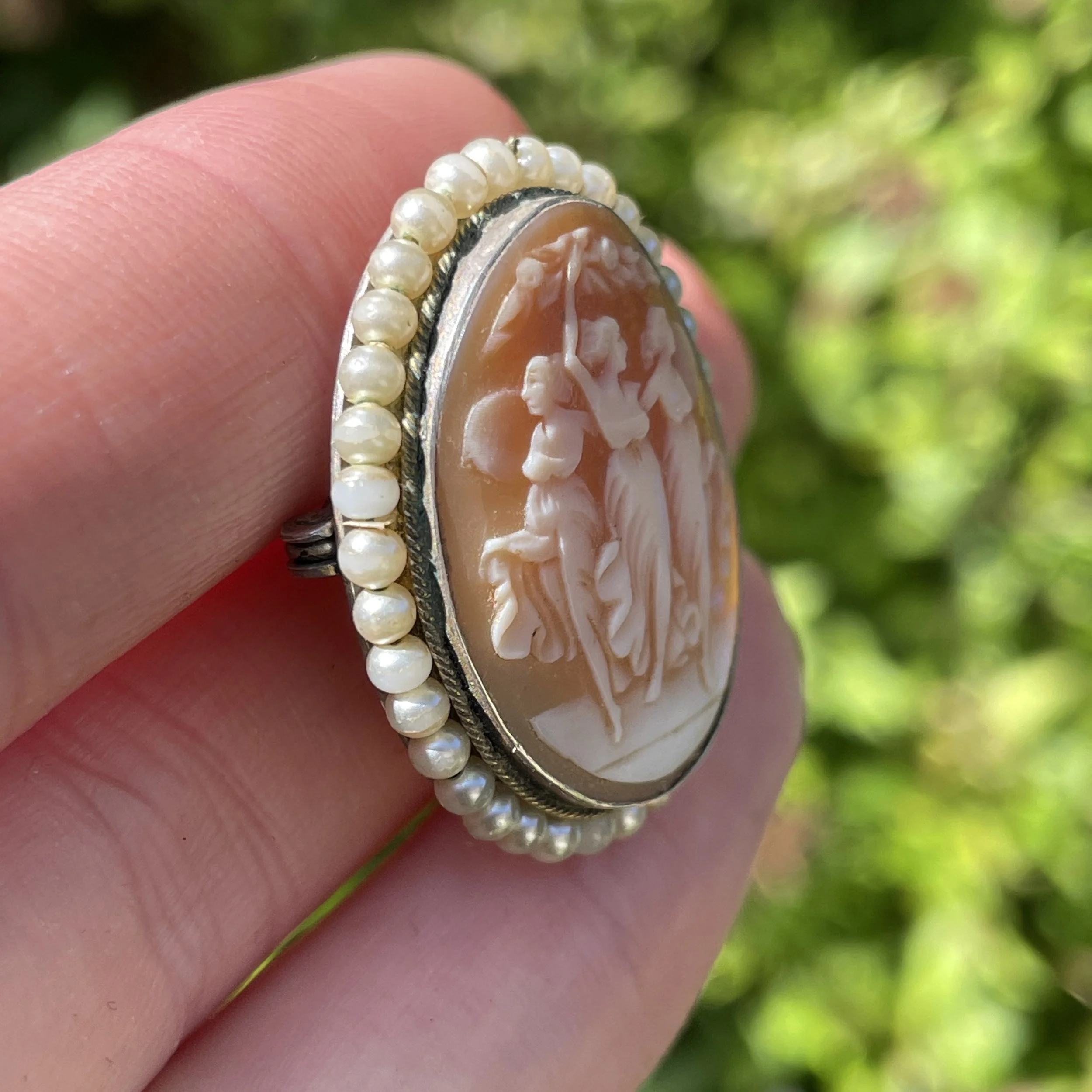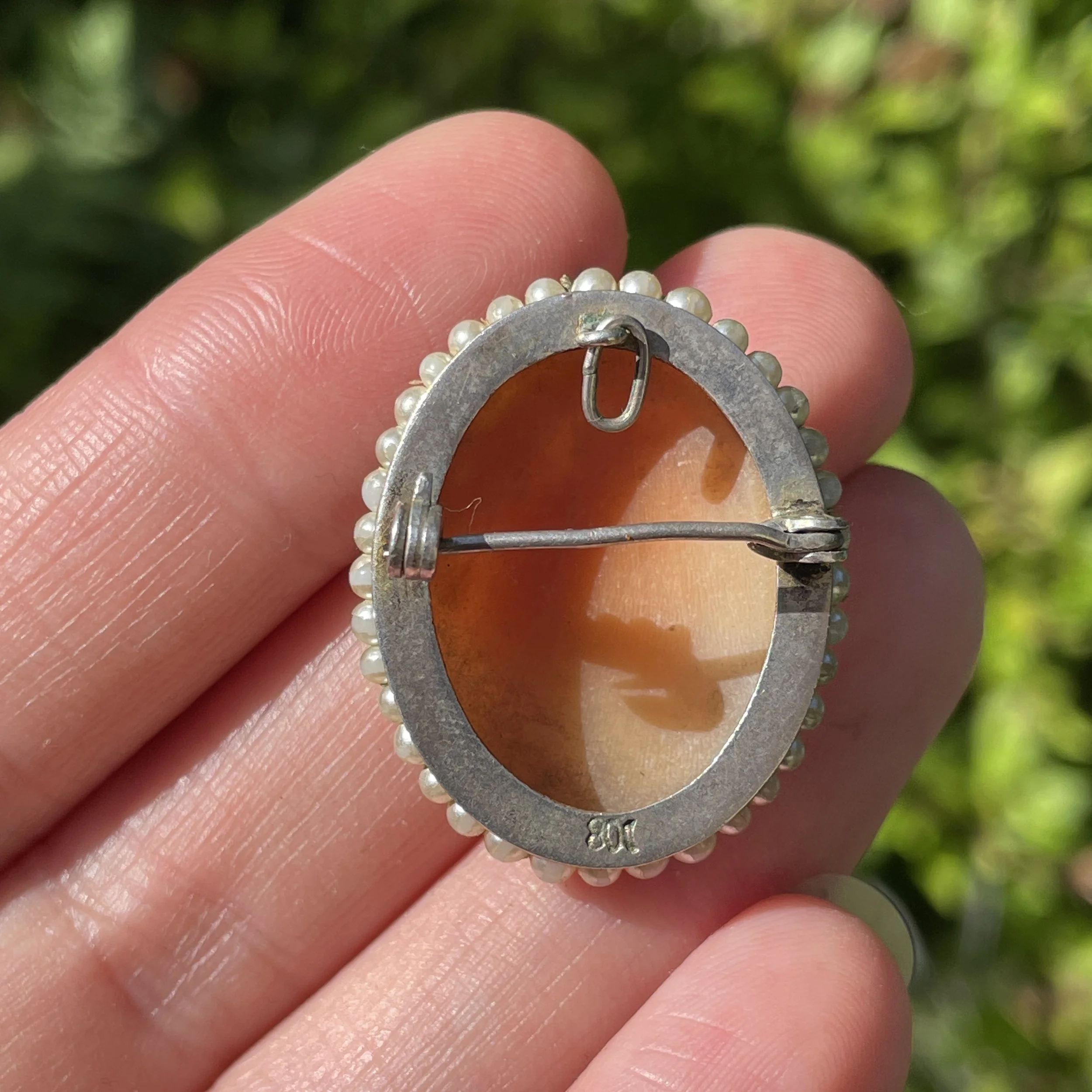 Here I have a vintage brooch, made from 800 grade silver and featuring a nicely carved shell cameo depicting the Three Graces. The back has a rollover-clasp and also a pendant loop at the top. It’s stamped for 800 silver. The outside of the cameo is surrounded by a halo of faux pearls.