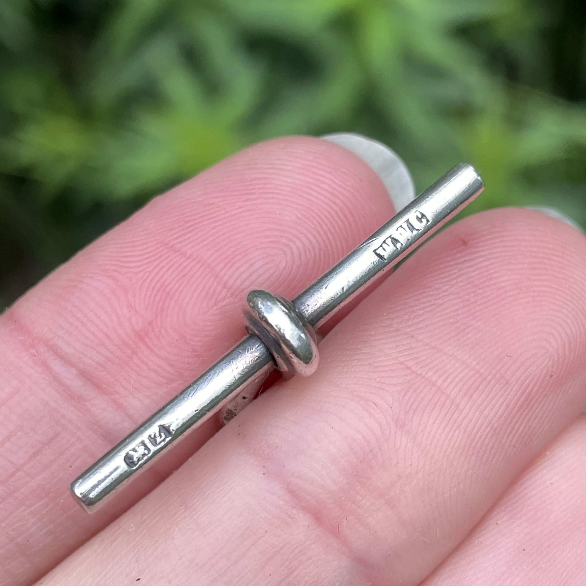 This antique T-bar is made from hallmarked sterling silver. It would originally have hung from a watch chin and it has a chunky sterling split ring at the top. The hallmarks show the lion passant for sterling silver, the date letter for 1924 and the maker’s initials, there’s also a lion on the hanging loop.